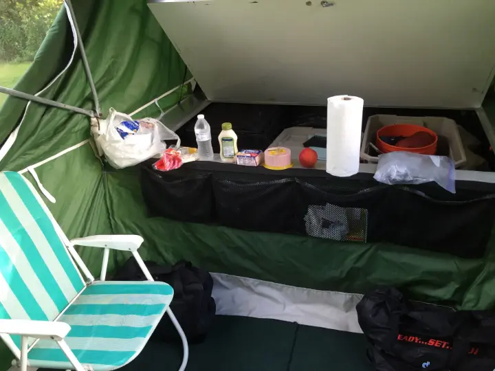 I keep all the items that need to be refrigerated in the Yeti cooler, and all the other items in the galley of the Aspen Classic Camper.