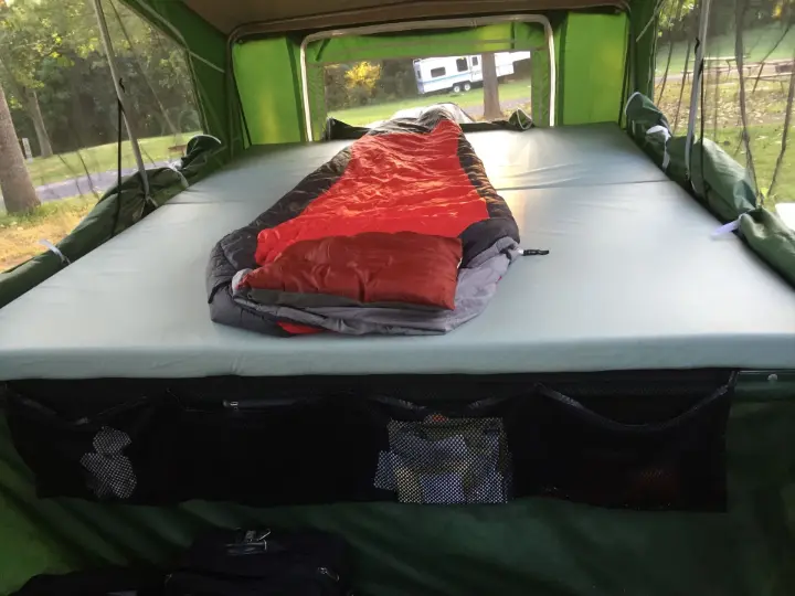 By the way, I have shown you my kitchen galley, so here is a peek at the same area after the galley was closed up and setup for sleeping (I don’t do sheets and blankets, just use either the sleeping bag for cold weather, the bag liner for mild weather, and both for frigid weather).